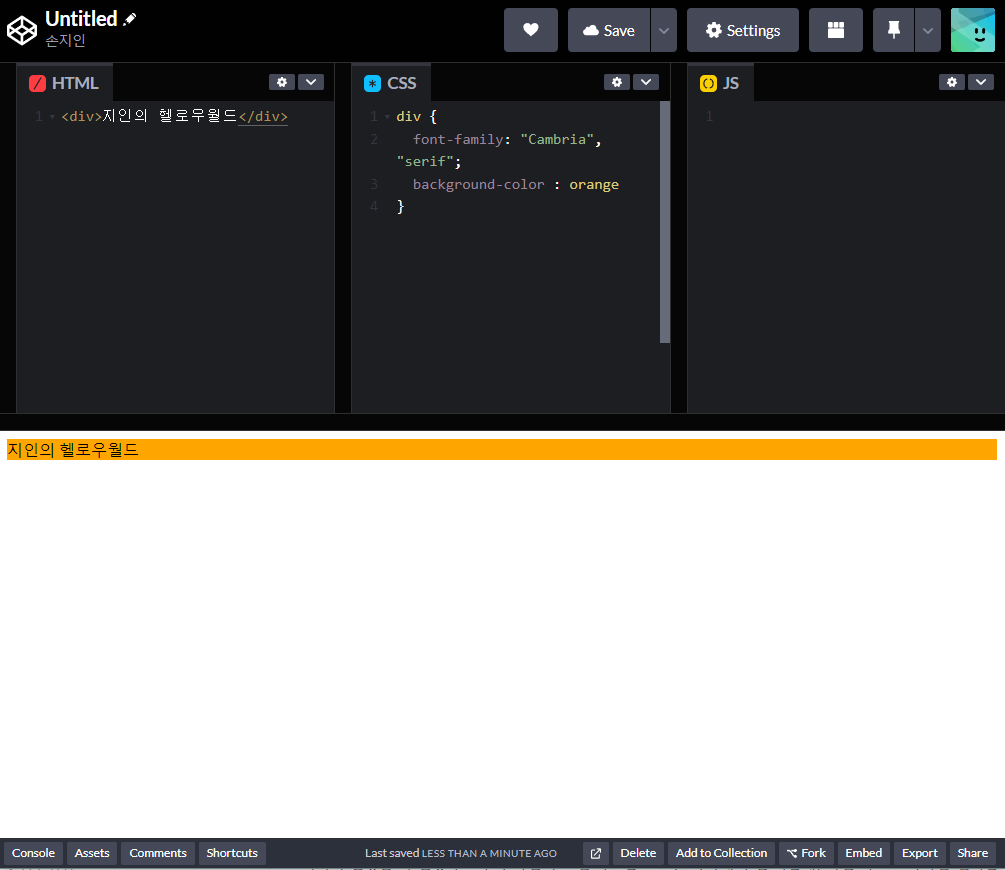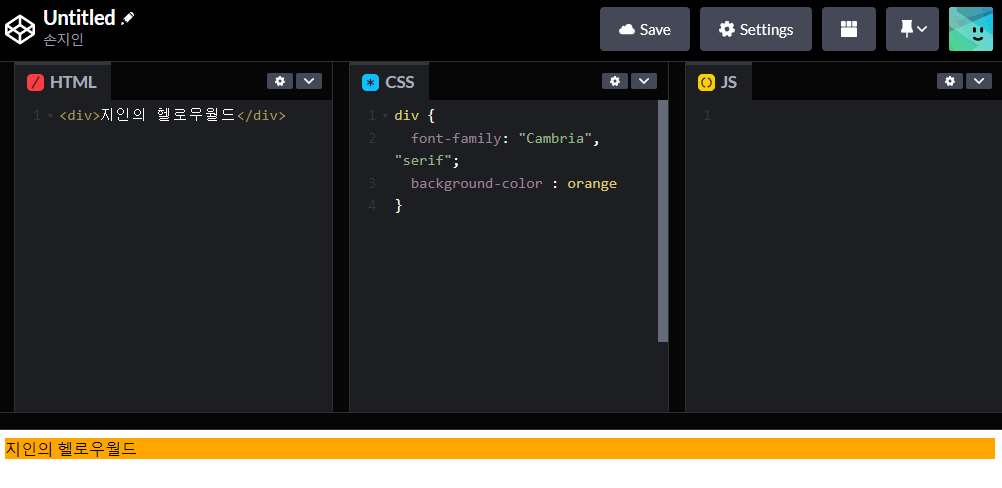 2번 과정을 통해 코드펜 사이트 화면에 코드가 출력될 것이다.