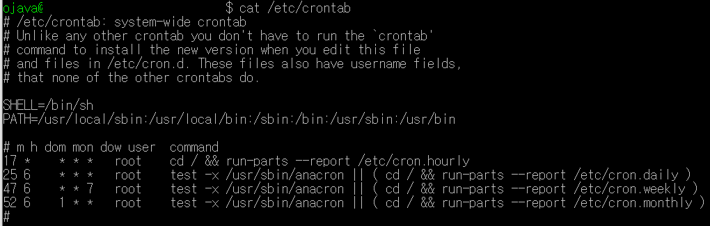 - etc 하위에 위치한 crontab파일을 열어 crontab 설정 방법을 확인한다.