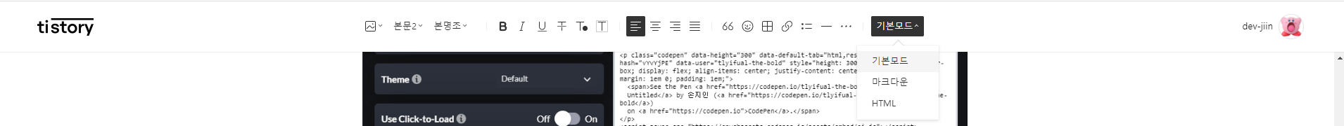 코드를 복사한 후, 티스토리로 돌아와서 상단바에 "기본모드"라고 적혀있는걸 "HTML"모드로 변경한다.