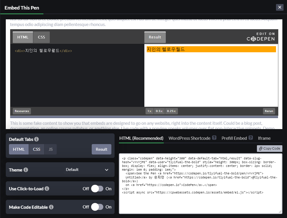 그 후, 원하는 위치에 코드펜에서 복사한 코드를 붙여넣기 하면 끝난다.